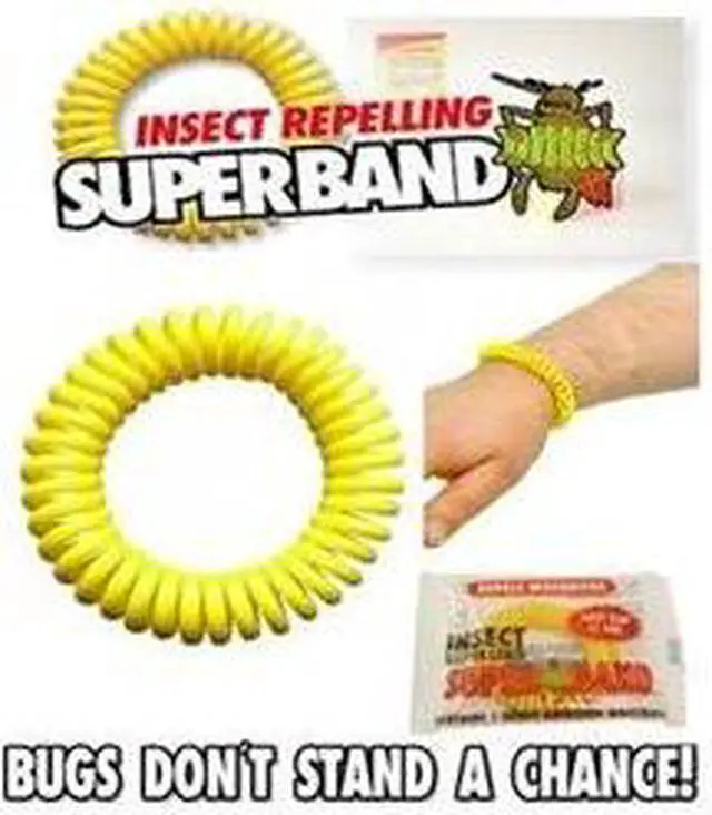SuperBand - Insect Repelling Wrist Band The insect repellent you wear on your wrist or ankle. The Superband creates an invisible shield around you so you don't have to deal with those pesky biting insects! The advanced waterproof system allows you to enjoy all of your normal activities without worrying about diluting the potency of the SuperBand. The SuperBand is one of the longest lasting natural insect repellents on the market today! Each band Lasts up to 200 hours and is safe for all ages with adult supervision. Simply slip the SuperBand on your wrist or ankle and enjoy a bug free day!