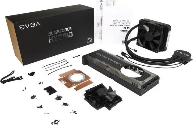 | Features | Compatible w/ all "reference" GTX 1080 Ti modles including EVGA PN: 11G-P4-5390-KR, 11G-P4-6390-KR, 11G-P4-6391-KR, 11G-P4-6393-KR, 11G-P4-6591-KR, 11G-P4-6593-KR, 11G-P4-6693-KR All-in-one cooling solution that is completely self-contained. No filling, no custom tubing, no maintenance. Just plug and play. Intelligent wiring system and sleeved tubing makes this one sleek cooler without the messy wires. Copper base provides maximum heat transfer. Variable controlled fans allow dynamic fan speed based on GPU temperature, and the water cooling efficiency means very low noise fans. Built in 120mm radiator and fan helps dissipate the heat keeping the GPU as cool as possible. Fan can also be swapped or customized. VRM and Memory cooling solution separated from GPU, allowing for the lowest GPU temperatures, and efficient VRM and Memory cooling. |