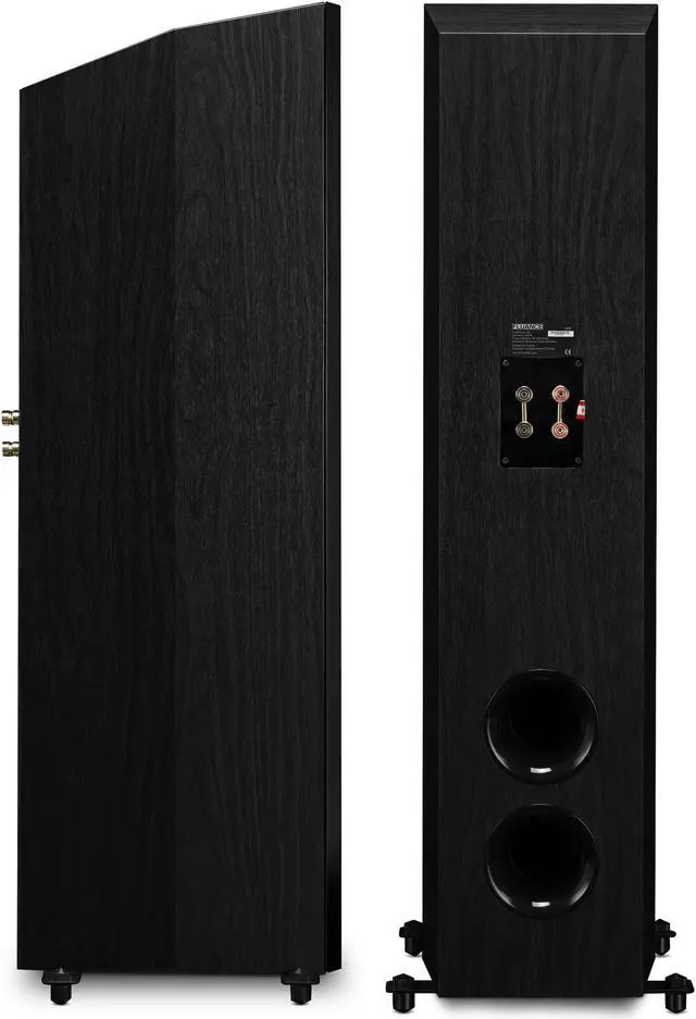 The cabinets are precision crafted with engineered MDF wood to create a warm, distortion-free sound. The tower speakers' cabinet is composed of separate internal enclosures keeping sound waves isolated to eliminate acoustic interference. Outriggers with sound-isolation floor spikes eliminate floor reverberation.
