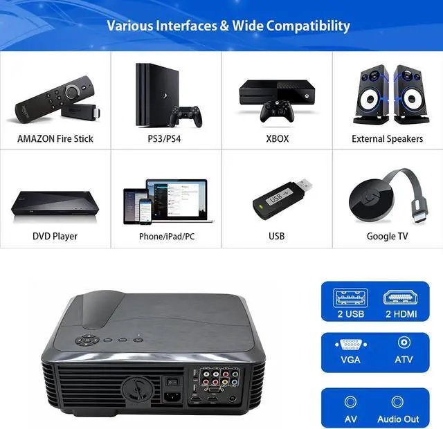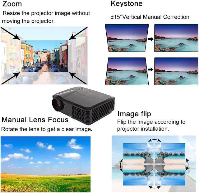 (Note: The cable is not included). * ±15° Keystone correction for proportional presentations. * Zoom out and 25 times digital zoom feature, more convenient to install and operate. * 360° image flip function, make your projector can be ceiling /rear/front mounted. * Flexible 1.5 - 9.0 m distance and 50-300 inch projection size. * Suitable for table top projection or ceiling projection and rear projection. * Built in double 5W Mega Bass Speakers, Stereo Surround sound system, support external speaker and earphone, like home audio speakers, headphones or portable speakers to pair big sound to the big viewing experience. * Supplemented with dozens of cooling fins to guarantee stability of clear images, removable dust screen, effectively block the dust,, extending working life. ------------------------------------------------------------------------------------------------------------------ # Using tips * Support 3D red and blue only, not support blu-ray 3D * TV tuner for analog TV, not for digital TV. * It comes with mount holes, Do not come with ceiling bracket and screws.