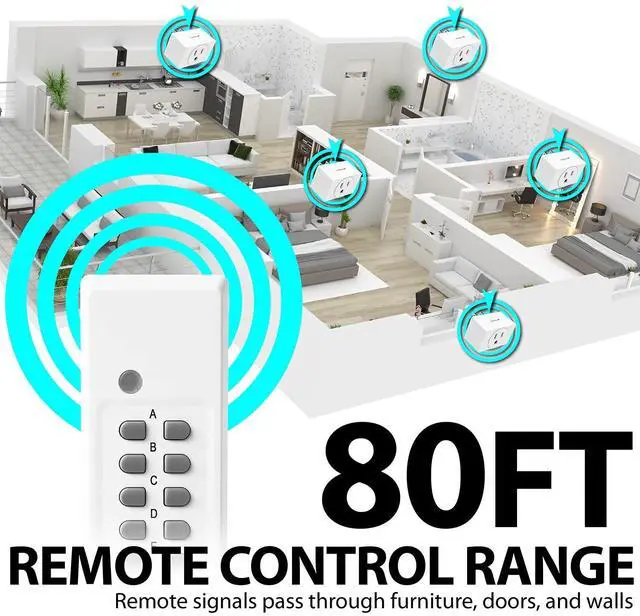 The RF remote can work up to 80 feet in an open area. The remote control is able to individually turn on and off each outlet, or control multiple outlets simultaneously with one button. Two remotes come in handy when you need to control outlets in different locations