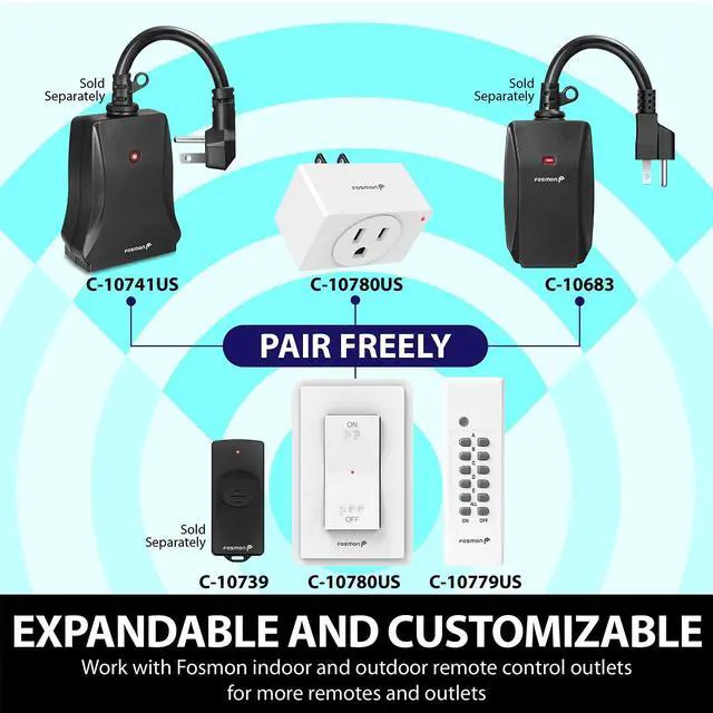 The plug and switch are compatible with Fosmon WavePoint indoor/outdoor remote control outlets, C-10683 and C-10741US, C-10780US, C-10785US, and C-10782US
