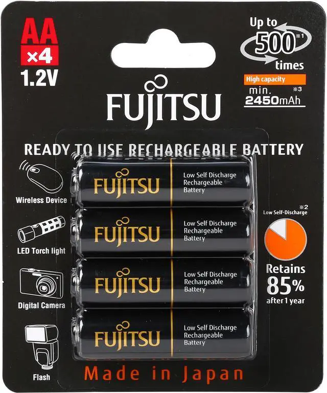 Conventional rechargeable batteries lose their energy daily, but not FUJITSU high charge retention batteries. They're ready to use, even after 1 year storage.