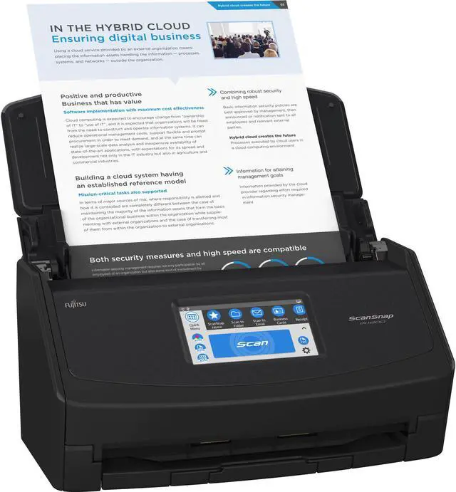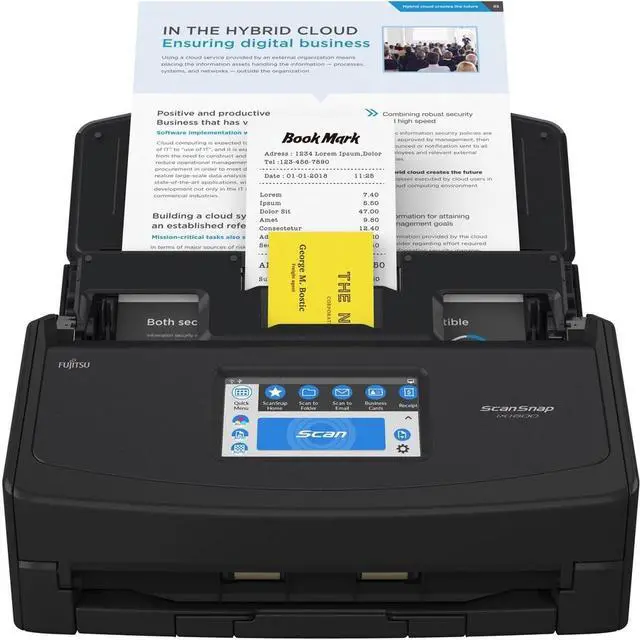 | Features | Intuitive 4.3-inch touch screen Wi-Fi (2.4 / 5GHz*)compatibility Speedy scans up to 40 ppm/80 ipm (A4-size documents, color, 300dpi) 50 sheets Automatic Document Feeder (ADF) For both individual and team use Ultrasonic Sensor and high-quality Brake Roller for stable feed Receipt Guide provides stable scanning for inconsistent paper sizes Streak Reduction producing clean images Best experiences with ScanSnap Home Conventional software ScanSnap Manager also available Connect to ScanSnap Cloud without the PC *Availability of 5 GHz Wi-Fi may vary depending on region. |