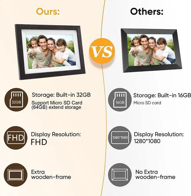 Compared with those WiFi digital photo frame frames with 8GB storage or 16GB memory, our digital frame with larger 32GB memory allows you to store more cherished memories.You can also import pictures in batches with the micro SD card (max.64GB, Not Included).