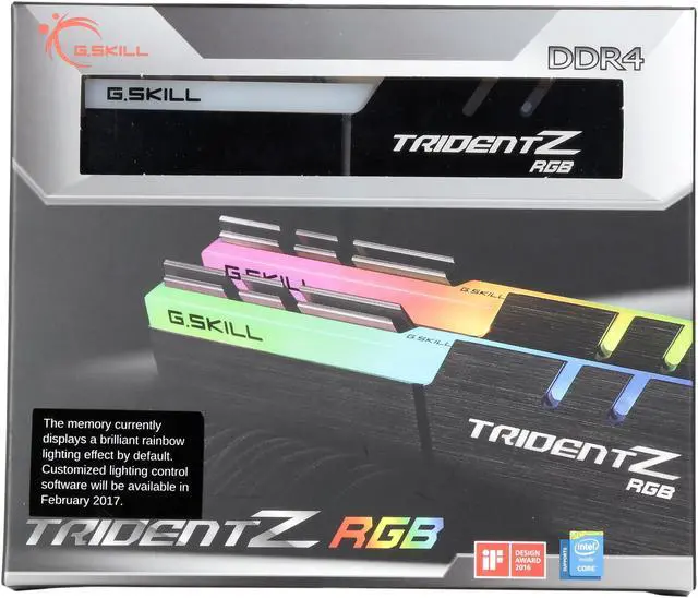 Featuring a completely exposed light bar with vibrant RGB LEDs, merged with the award-winning Trident Z heatspreader design, and constructed with the highest quality components, the Trident Z RGB DDR4 memory kit combines the most vivid RGB lighting with uncompromised performance.