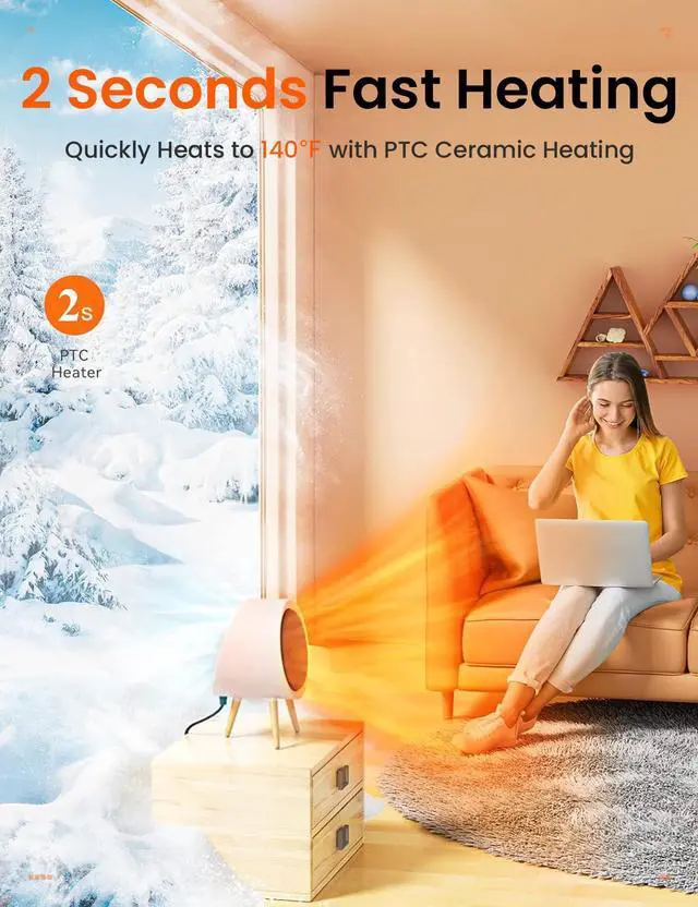 • Energy-Efficient Comfort: This small space heater features a PTC ceramic heating element that rapidly reaches 140°F(60°C) in only 2 secondsdelivering fast, consistent warmth while using less energy. Perfect for staying cozy without spiking your power bill