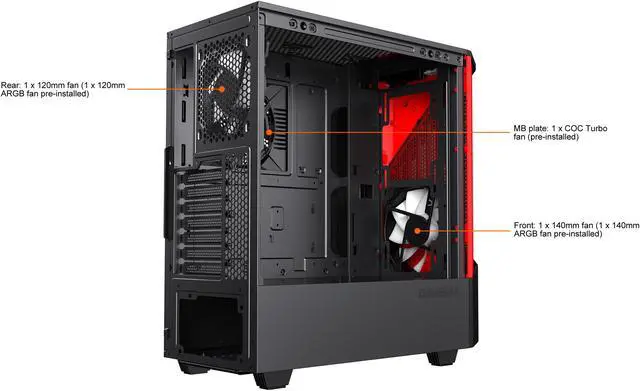 • 5 fans capability provides great cooling performance (1x 140mm ARGB LED fan x front, 1x 120mm ARGB fan X rear, 1x COC Turbo fan on MB plate pre-installed)