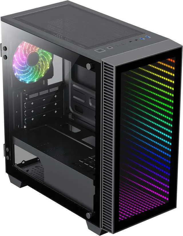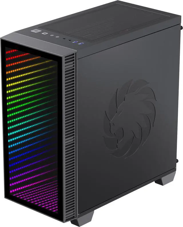 • The GameMax Mini Abyss Upgraded new edition with an infinity mirror with Rainbow LED lighting (addressable) on the front and a tempered glass front panel and side panel.