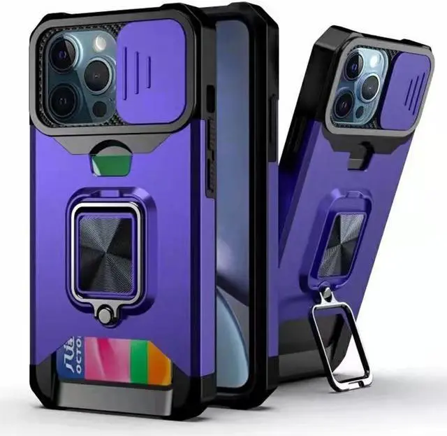 Rugged Shockproof Heavy Duty Phone Case Slide Lens Protector Card Slot Armor Ring Stand(Purple, iPhone 12 Pro Max)