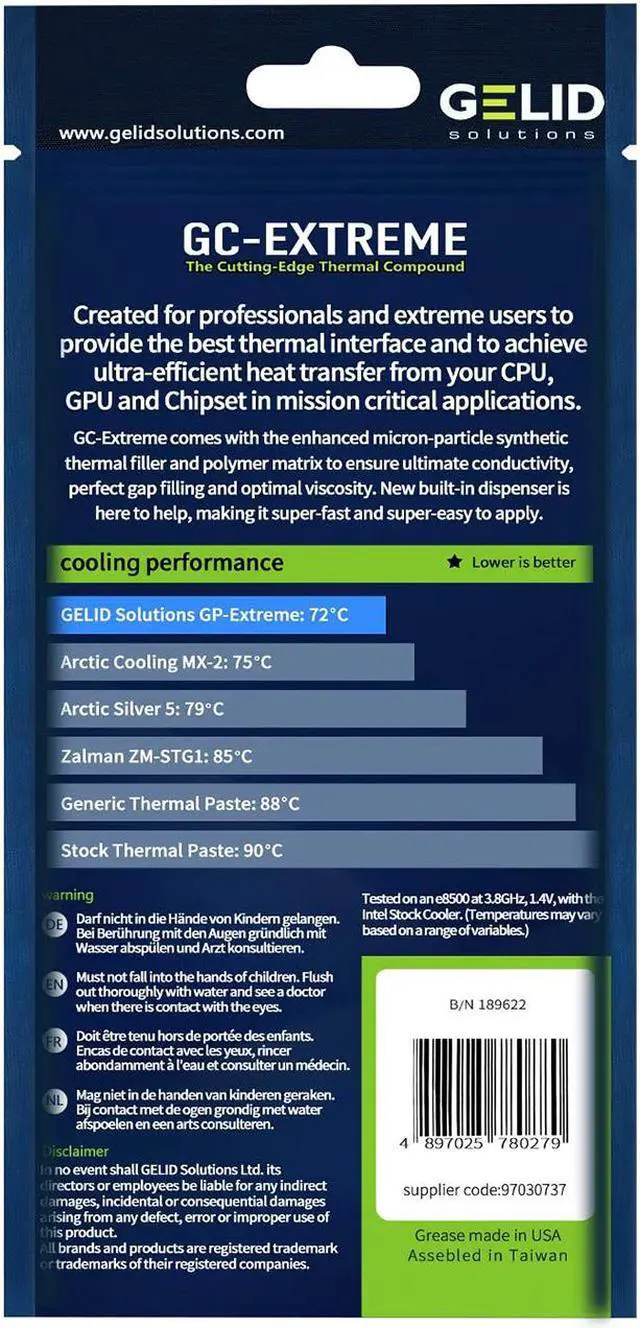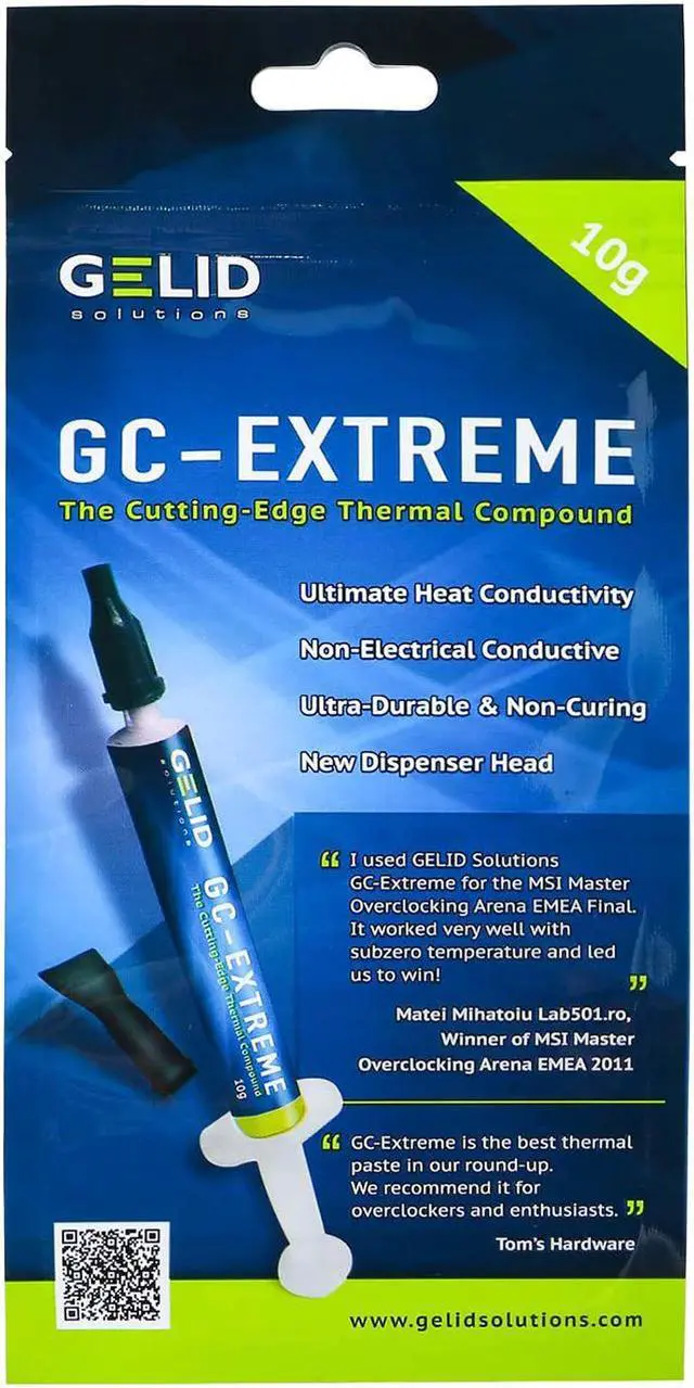 Created for Extreme Users on highest level the GC-Extreme thermal compound (1g, 3.5 g, or 10g) achieves the best heat conductivity from your CPU, VGA or even Chipset to your cooler. The GELID applicator enables an easier application. It contains the same material as the multi-winning “GC-Extreme 3.5 g” and varies in net content only. In comparison to the other compounds in the market the “GC-Extreme” breaks all records and is most suitable for overclocking. Ultimate heat conductivity makes the “GC-Extreme” the leader of all thermal compounds. As with the other compounds of GELID Solutions the “GC-Extreme” is non-electrical conductive, non-corrosive, no bleeding and non-curing.