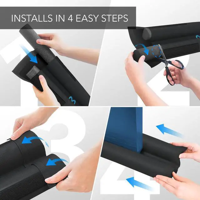It’s imperative you measure the door’s width and gap height prior to purchasing to ensure it works properly. Insert the foam tubes and cut any excess foam for the right fit. Close the hook and loop fasteners. Slide underneath your door.