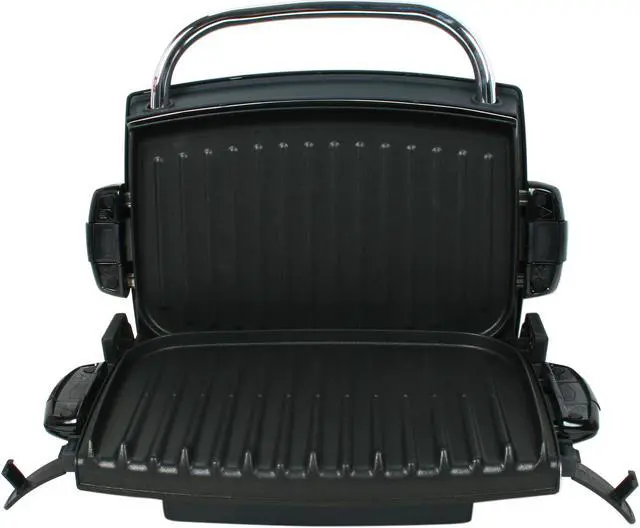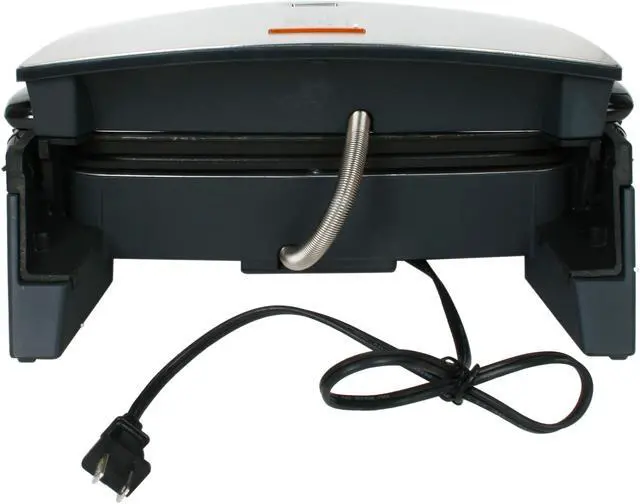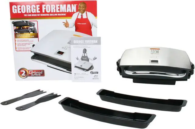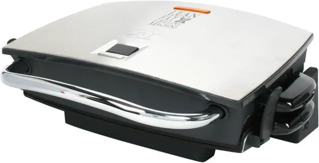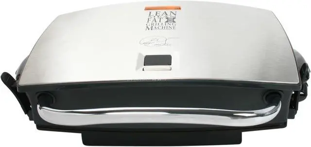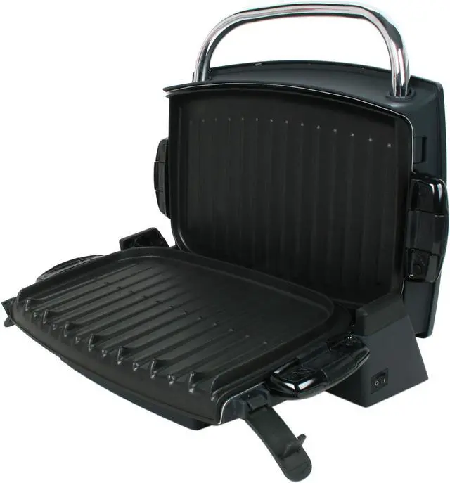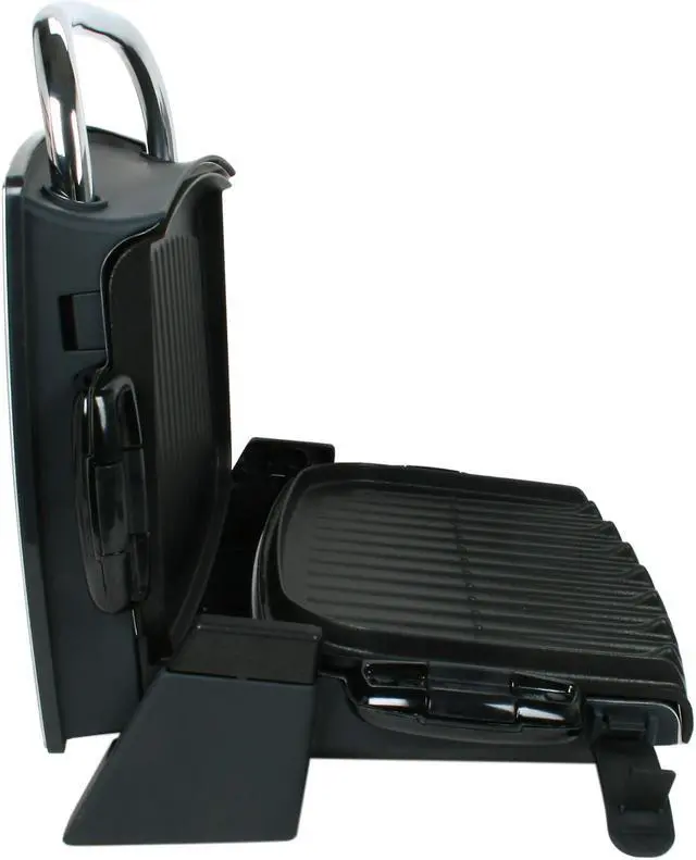 | Features | 72 square inch grilling surface lets you cook for 4 1.5" float & lock hinge for top melting and broiling 2 Dishwasher-safe removable grill plates for easy clean up Locking side latches make vertical storage a snap Metal loop handle easy to handle and carry. Safe - Touch top housing for safety Digital countdown timer makes for convenient grilling On / Off switch for ease of use Temperature indicator light indicates plates are at grilling temperature George Tough Triple non-stick coating is durable & eliminates need for oil Particular sloped grill design knocks out the fat Embedded heat elements provide consistent heat & rapid recovery time 2 drip trays catch run off liquids for no-mess clean up 2 spatulas are customized for grill |