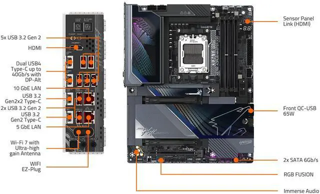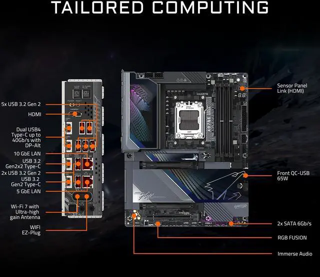 Comprehensive Connectivity: 2x PCIe Gen 5 x16 slot with reinforced PCIe UD armor, 2x PCIe 5.0 M.2 slots, 3x PCIe 4.0 M.2 slots, 2x USB4 Type-C with DP-Alt, 1x USB 3.2 Gen 2x2 Type-C, 1x USB 3.2 Gen 2 Type-C, 7x USB 3.2 Gen 2 Type-A, 65W Front USB-C, Sensor Panel Link (HDMI) for onboard video port for hassle-free in-chassis panel setup.