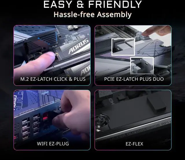 DIY Friendly Design: Smooth building experience with suite of easy building features, such as PCIe EZ-Latch Plus Duo for single-click release design for GPU, M.2 EZ-Latch Click and Plus for screwless installation of M.2 heatsink and SSD, M.2 EZ-Match for easy heatsink reattachment, WIFI EZ-Plug for quick installation for the WIFI antenna, DriverBIOS for pre-installed W-Fi drivers, and Rear EZ-button for organized troubleshooting.