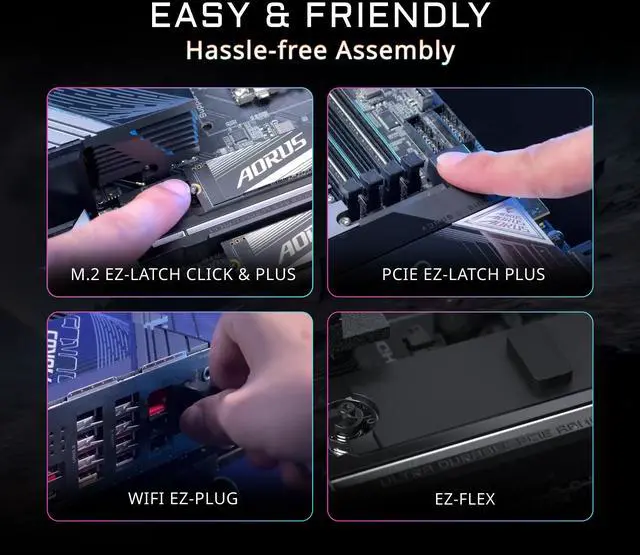 DIY Friendly Design: Smooth building experience with suite of easy building features, such as PCIe EZ-Latch Plus for single-click release design for GPU, M.2 EZ-Latch Click and Plus for screwless installation of M.2 heatsink and SSD, M.2 EZ-Match for easy heatsink reattachment, WIFI EZ-Plug for quick installation for the WIFI antenna, DriverBIOS for pre-installed W-Fi drivers, and Rear EZ-button for organized troubleshooting.
