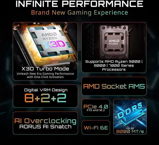 X3D Turbo Mode's unique optimization parameters allow even Ryzen™ 9000 X3D gaming Performance enhance & Ryzen™ 9000 non-X3D processors to achieve similar gaming performance levels as their Ryzen™ X3D counterparts. Experience smoother gameplay, higher frame rates, and reduced latency with GIGABYTE's BIOS innovation- X3D Turbo Mode.
