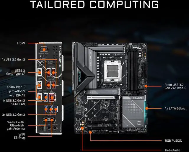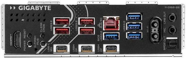 | Back I/O Ports | 1 x HDMI port, 1 x reset button, 1 x power button, 1 x Clear CMOS button, 1 x Q-Flash Plus button, 4 x USB 3.2 Gen 2 Type-A ports, 1 x USB Type-C port, 2 x USB4 USB Type-C ports, 1 x RJ-45 port, 4 x USB 3.2 Gen 1 ports, 2 x antenna connectors, 2 x audio jacks, 1 x optical S/PDIF Out connector |