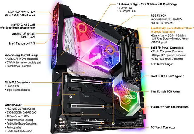 Intel Z390 Gaming motherboard XTREME COMBO with pre-tested Intel Core i9-9900K, 16 Phase IR Digital VRM, AORUS All-In-One Monoblock, RGB Fusion 2.0, 802.11ac Wireless, Intel Thunderbolt 3, ESS SABRE 9018K2M DAC, AQUANTIA® 10GbE LAN, RGB FAN COMMANDER, OC Touch