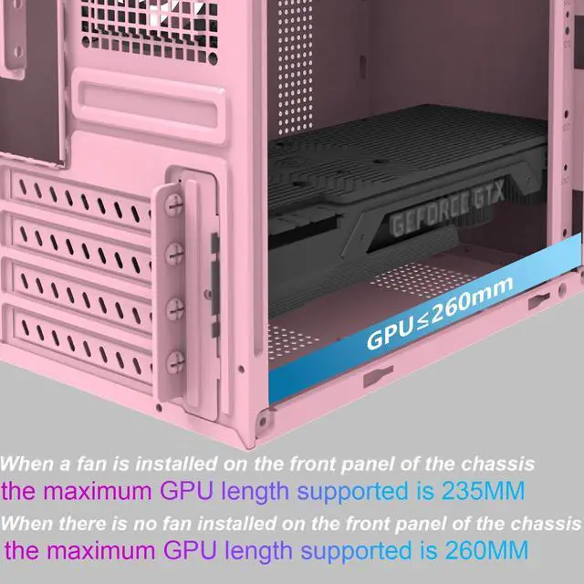 GPU length limit: In the case of no chassis fan placed on the front board, the longest supported range of the graphics card is less than or equal to 260MM. If a fan is placed on the front board, the longest supported range of the graphics card is less than or equal to 235MM