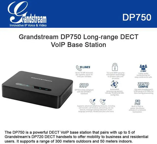 - SIP DECT Base Station for DP720 Cordless Handset- Cordless handset sold separately Supports up to 5 handsets 10 SIP accounts and 5 concurrent calls- Supports a range of up to 300 meters outdoors and 50 meters indoors- TLS and SRTP security encryption- Automated provisioning options include TR-069 and XML configuration files- Use with UCM IP PBXs for Zero Config provisioning-