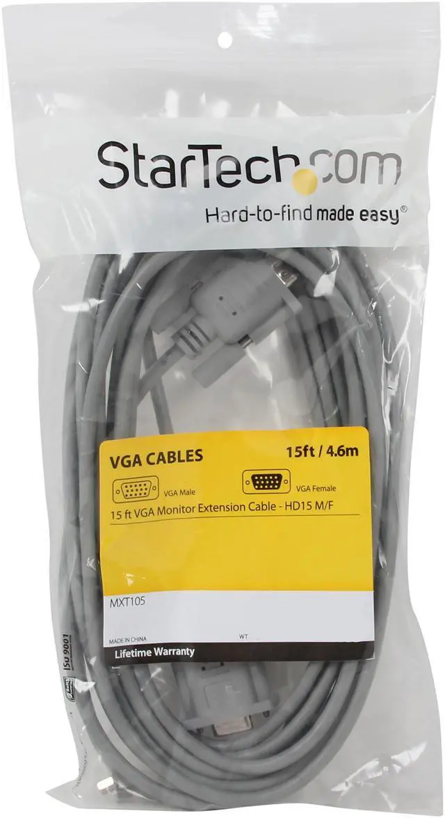 This 15ft SVGA/VGA monitor extension cable lets you extend your VGA cable connection by 15ft. The cable supports a maximum video resolution of up to 800x600. For applications that require higher resolutions, see our 15ft Coax VGA Extension Cable (MXT105HQ). The MXT105 is backed by StarTech.com's lifetime warranty for guaranteed reliability. Supports video resolutions up to 800x600Position your monitor an additional 10ft away from your computerGuaranteed reliability Manufacturer Part NumberMXT105Product ModelMXT105Product NameVGA Monitor Extension CableProduct TypeVideo CableCable TypeVGACable CharacteristicExtension CableCable Length15 ftConnector on First End1 x 15-pin HD-15 Male VGAConnector on Second End1 x 15-pin HD-15 Female VGADevice SupportedMonitorVideo DeviceSupported Resolution800 x 600ColorGrayLimited WarrantyLifetime