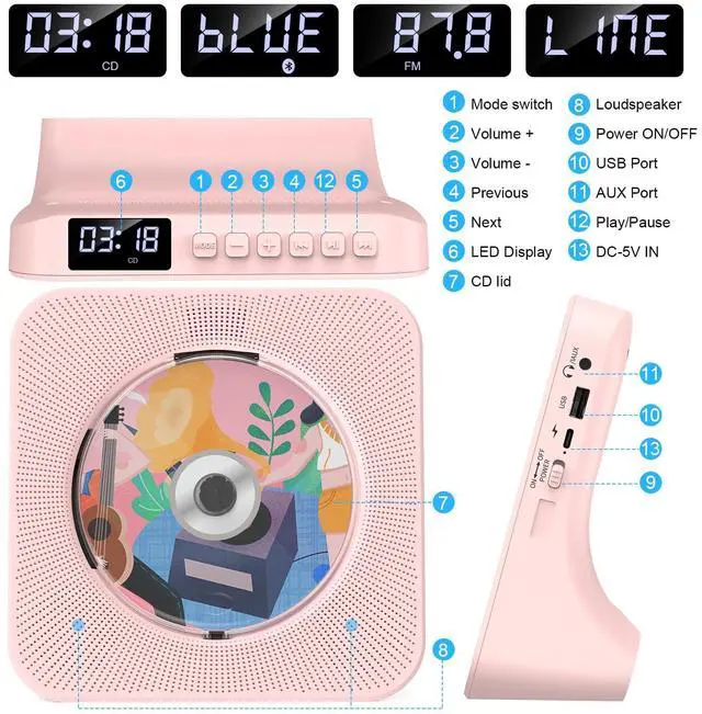 - [Wide Compatibility&FM Radio]A LCD screen is equipped on the top of the Bluetooth CD player, so you can choose the 5 modes(CD/Bluetooth/FM/AUX/USB) at your convenience. Home music cd player also has FM radio. The radio frequency is 76-108.0 MHZ. You could enjoy music on the radio, CD, U disk, or mobile phone.