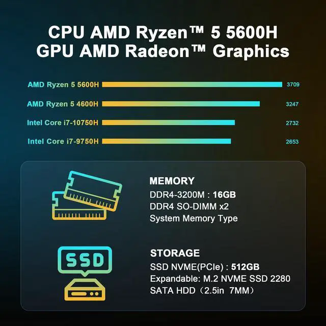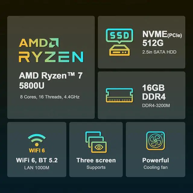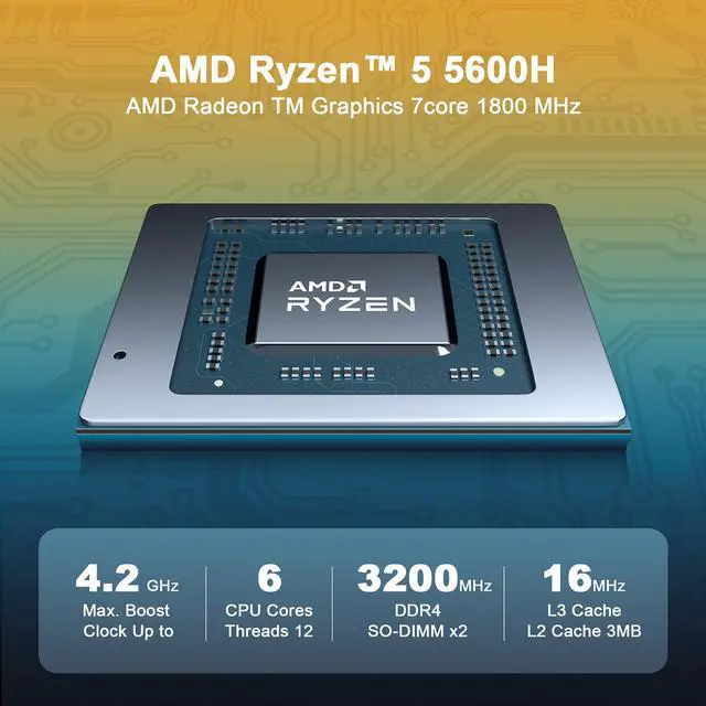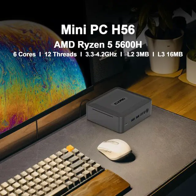 Introducing the GXMO Mini PC powered by the AMD Ryzen 5 5600H processor, boasting 6 cores and 12 threads that can turbo up to 4.2 GHz. This H56 Mini Computer is equipped with 16GB DDR4-3200M RAM and a speedy 512GB PCIe SSD, ensuring seamless multitasking and storage efficiency. Ideal for productivity and entertainment, this small Micro Desktop PC supports a three-screen display setup, offering versatility in your workspace.