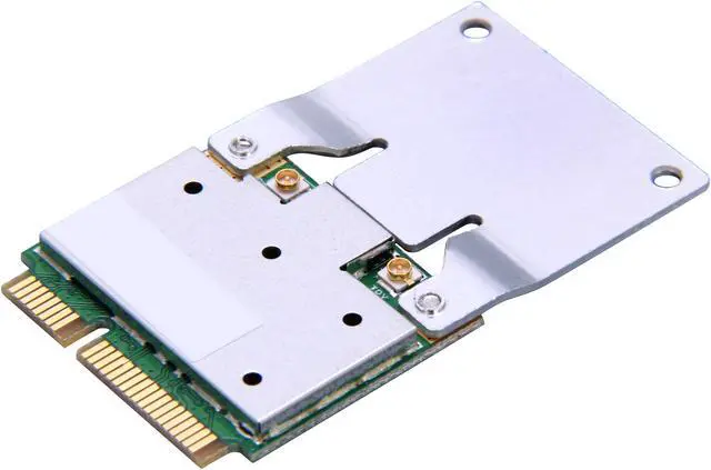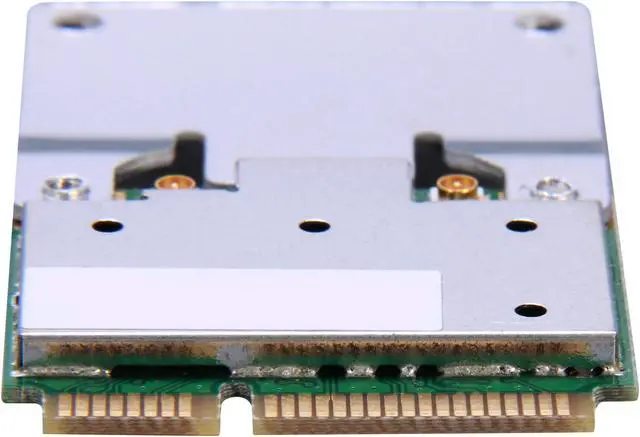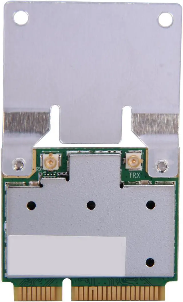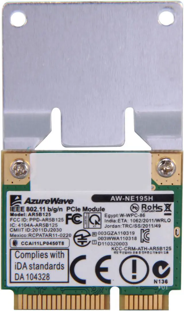 | Specifications | Interface: Mini-PCIe Chipset: Atheros AR1111(MAC/Baseband/RF) single chip Frequency Range: Wi-Fi: 2.4 GHz ISM Bands 2.412-2.472 GHz, 2.484 GHz Operation Range: Open Space: ~300m; Indoor: ~100m Output Power: 802.11b: 17 dBm +/- 2.5dBm (11Mbps) 802.11g: 13 dBm +/- 2.5dBm (54Mbps) 802.11n HT20 : 11 dBm +/-2.5dBm (HT20 MCS7) 802.11n HT40 : 11 dBm +/- 2.5dBm (HT40 MCS7) Receive Sensitivity: 802.11b: less than -76 dBm (11Mbps) 802.11g: less than -65 dBm (54Mbps) 802.11n: less than -64 dBm at HT20 MCS7 less than -651dBm at HT40 MCS7less than -65 dBm at HT20 MCS7 Dimensions: 1.2" x 1" x 0.2" Weight: 0.25 lbs. |