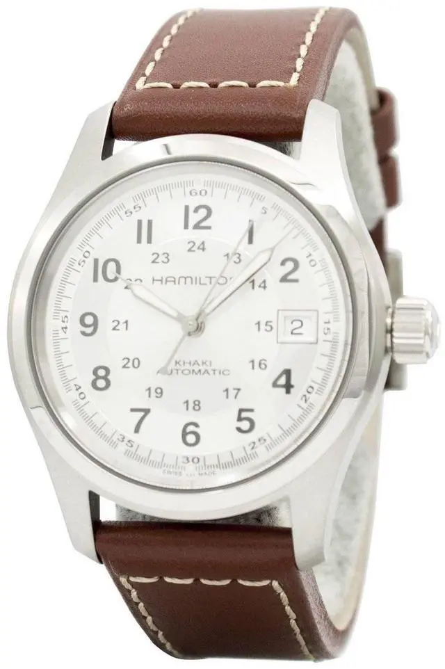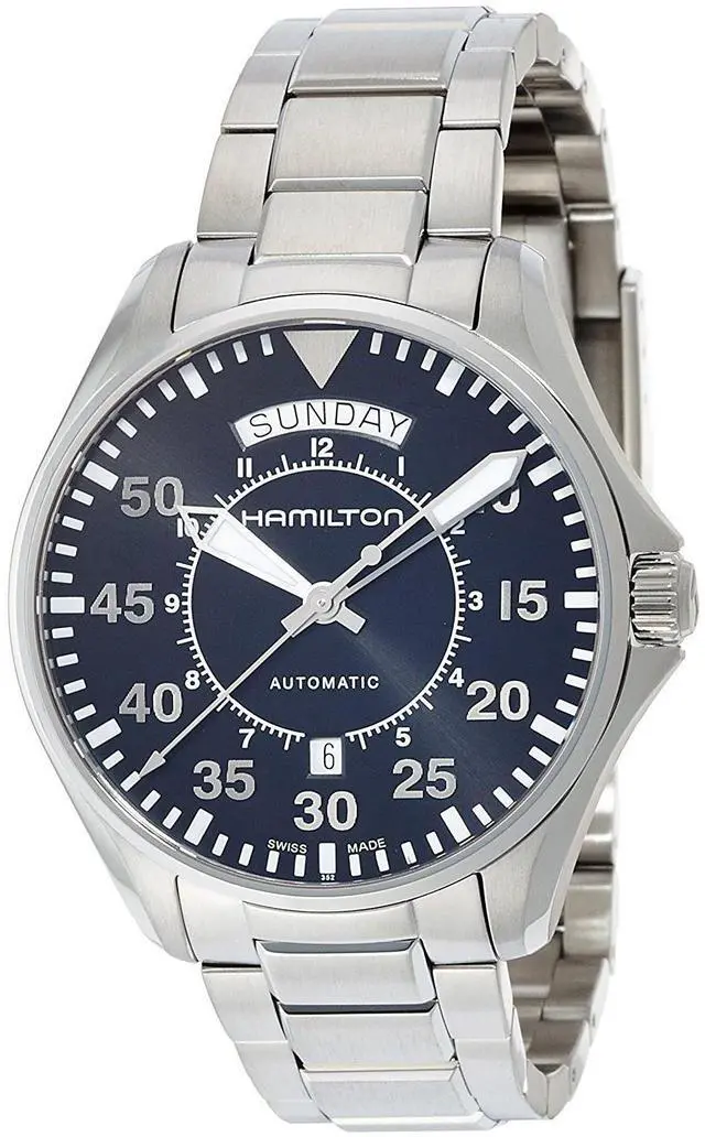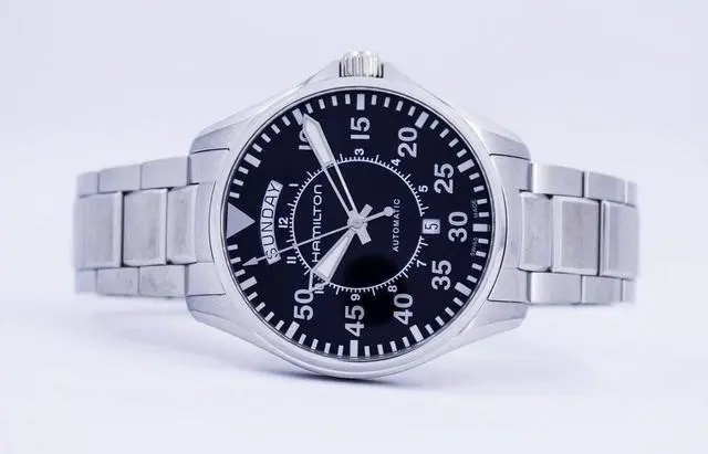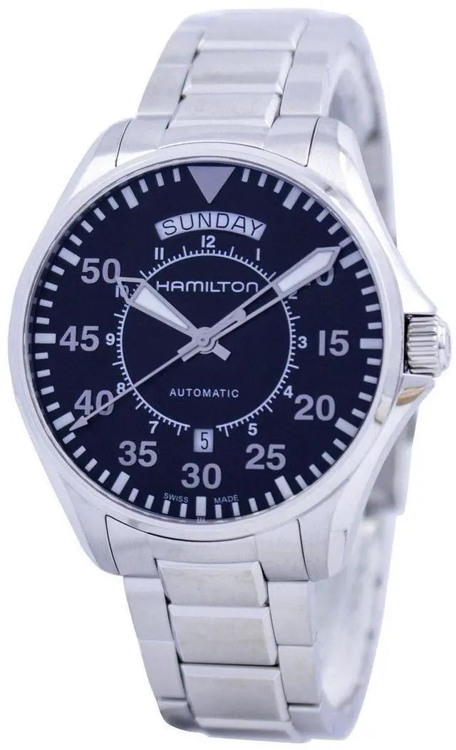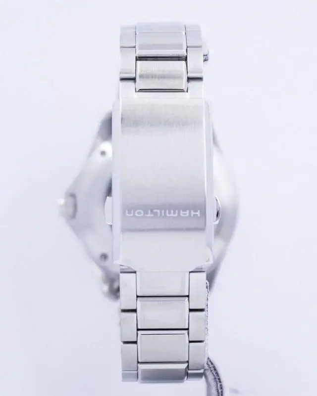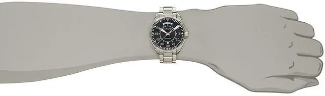 Dress watch, Precision Swiss automatic self-winding movement, Brushed silver-tone skeleton hands with luminous accents, Continuously sweeping brushed silver-tone seconds hand, Applied brushed silver-tone Arabic numbers, Smaller glossy white Arabic numbers and indices form inner 12-hour track, Applied luminescent indices form surrounding minute track, Analog date aperture above six o'clock position, Retrograde analog day aperture below twelve o'clock position, Brushed black dial with glossy white logo below twelve o'clock position, Brushed silver-tone stainless steel bracelet with adjustable links and push-button-clasp, Polished silver-tone stainless steel bezel, Brushed silver-tone stainless steel round case with polished accents and hexagonal edges, Textured steel crown with 'H' logo, Stainless steel screw-in exhibition caseback, Sapphire crystal, 10 ATM (100 meters/330 feet water resistant)