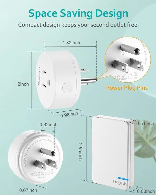 Hapythda wireless control outlet with dimensions(Dia x H): 2.36 x 0.47 in, free your second outlet. And the wireless remote base can be pasted at will by 3M glue, you can place it on your sofa, on your nightstand. Fix the remote base plate to any spot you want, so that you can reach it easily.