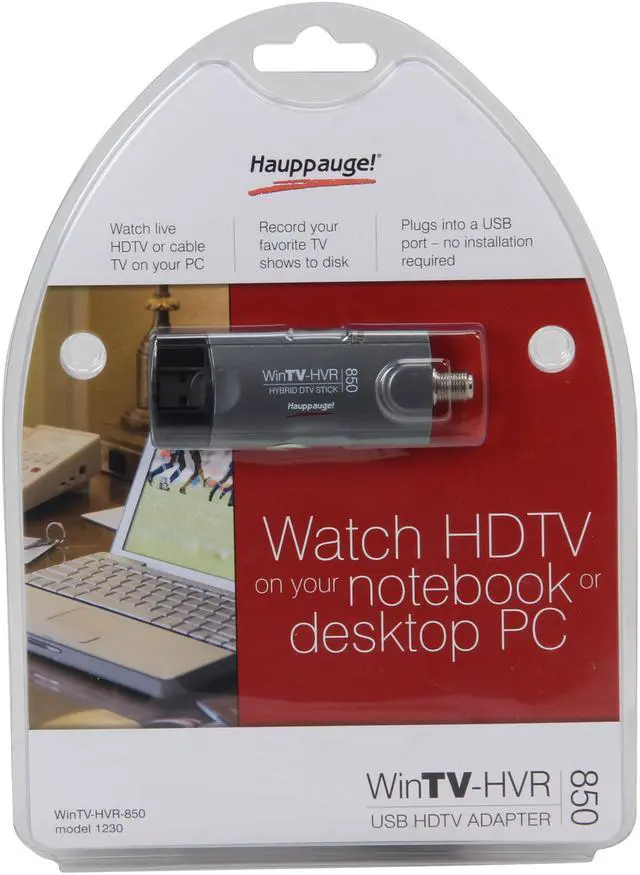 Turn your laptop or PC into TV with the Hauppauge 1230 TV stick. This external TV tuner connects to your computer with a USB 2.0 connection so you don't have to open your case to get TV on your PC. The hybrid tuner can handle NTSC analog signals along with ATSC digital signals up to 1080i.