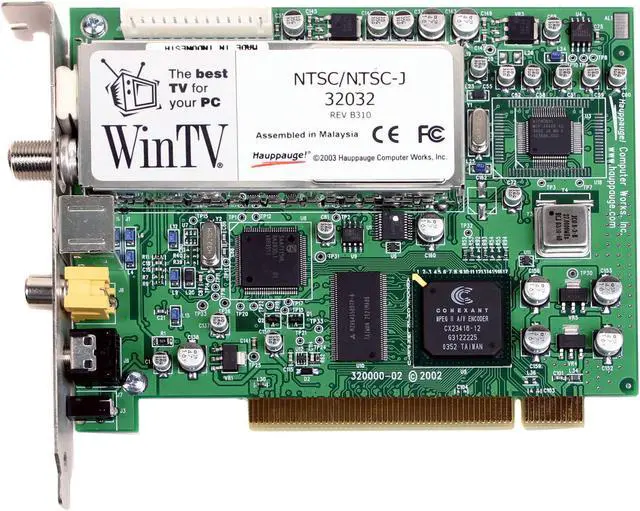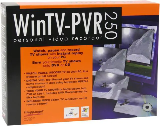 | Features | Watch TV in a window on your PC screen (any size), or watch TV full screen! Record your home videos and TV shows to disk using MPEG compression. The built-in hardware MPEG encoder allows you to continue to use your computer while recording. Surf the net or answer e-mail while digitally recording to your PC's hard disk! Schedule your TV recordings with WinTV-Scheduler. The Electronic Program Guides TitanTV.com in the U.S., TVTV.de in Europe and iEPG in Japan, are Internet based program guides which work with WinTV-PVR to help schedule your TV recordings Pause and instantly replay your TV shows, with 2X and 8x digital fast forward and rewind Capture high quality still video images from live or recorded TV Edit your TV shows or home videos with the Hauppauge MPEG Editor With the included DVD MovieFactory, you can author your home videos onto CD or DVD |