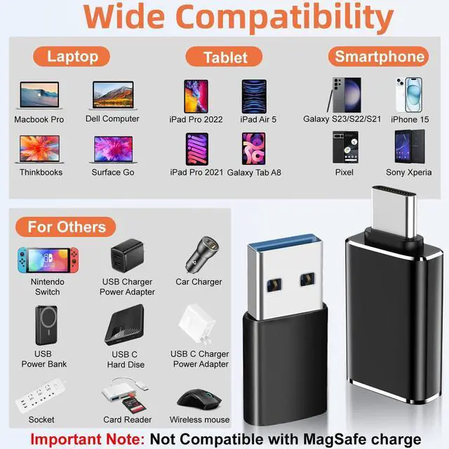 - USB-C Female to USB Converter compatible with iPhone X/11/12/13/14/15, Apple Watch SE/7/8/Ultra, iPad Pro/Air/Mini 6, Samsung Galaxy S24/S24+/S24 Ultra/S23/S23+/S23 Ultra/S22/S22+/S22 Ultra/S21/S21+/S21 Ultra/S20/S20+/S20 Ultra/Note 10/Note 20, Google Pixel 7/7A/6/5/4/4A/3/3A/2/XL and more other Type-C supported devices.
