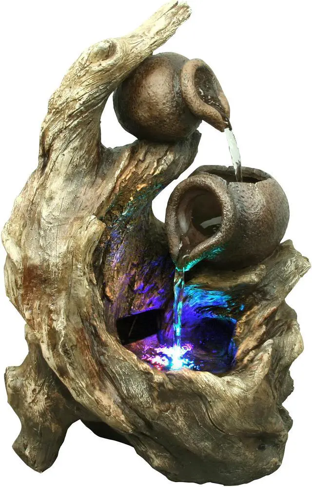 | Features | A small jug pours into a larger pot which then pours into the trunk base. Features a beautiful RGB LED light. Material: Durable Polyresin Pump and lights included CSA/CUL approved adapter included Adjustable Flow Rate Design: Tiered/Cascade Indoor/Outdoor use |