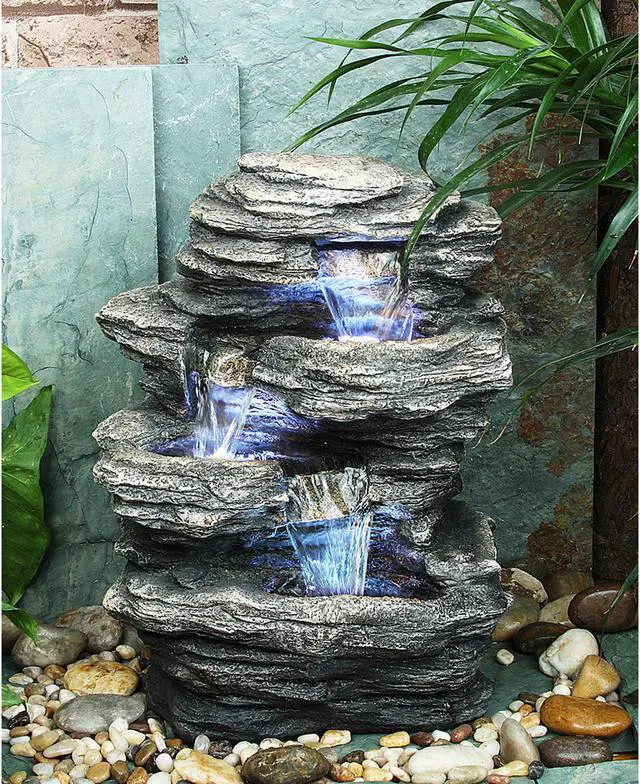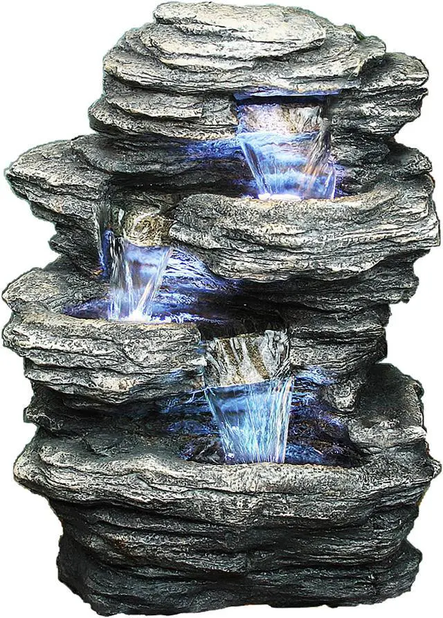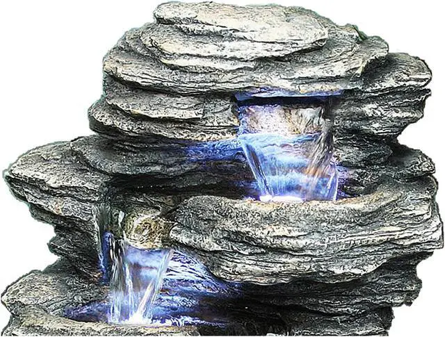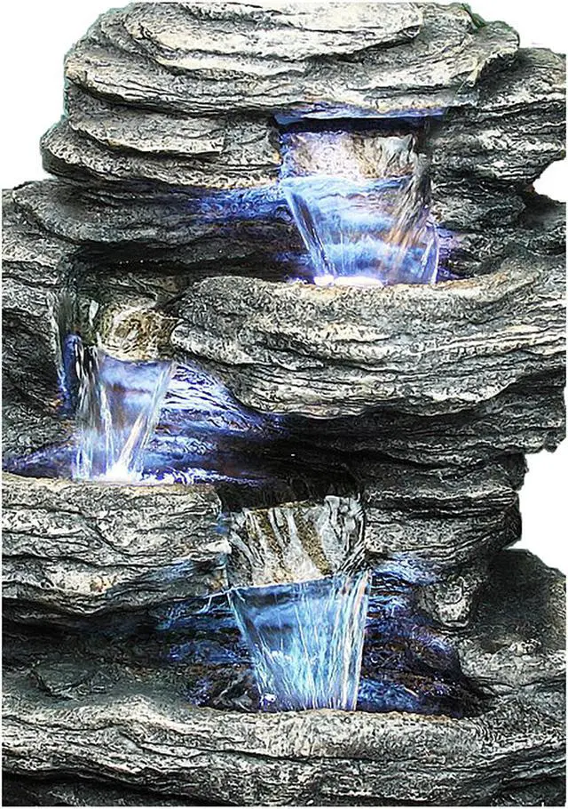 | Features | 4 Level Rock Fountain. This fountain appears to have been carved from a rugged boulder. Features four (4) different levels of rock with three (3) water spouts each cascading into the next level. LED lights create a unique atmosphere as the light reflects off the water. Made from durable polyresin. Ideal for indoor and outdoor use. Water Fountain Rock Look Pouring into 3 Levels Includes Pump Table-top design, COLOUR: Grey, Item Composition: Polyresin |