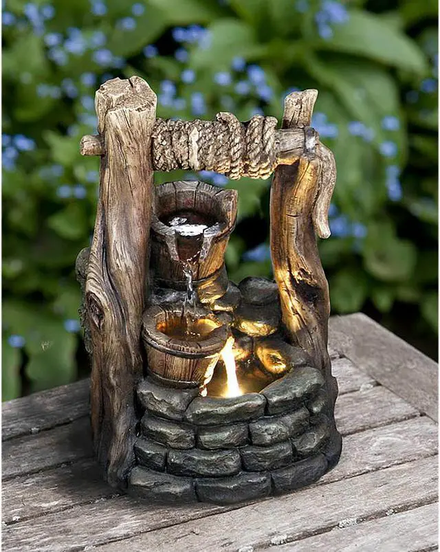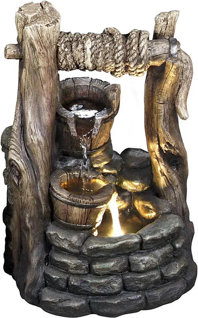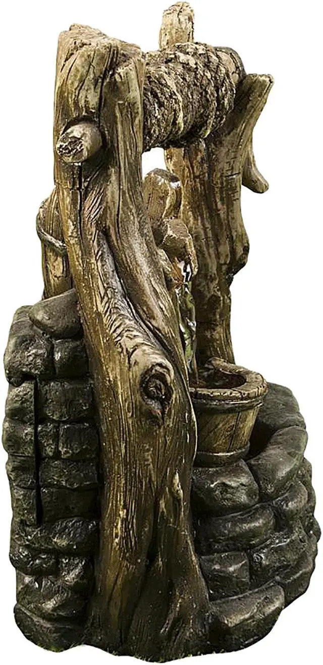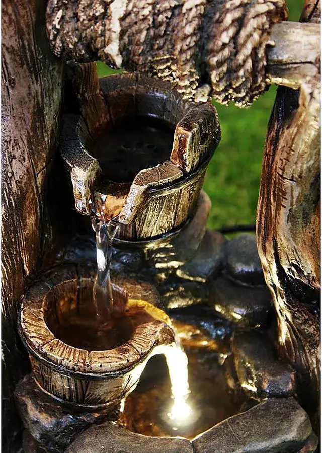 | Features | Add charm and elegance to your home or garden with this exquisitely designed fountain. Capture the calming sound of water as it cascades from the top bucket. The well is constructed of a stacked stone lay out with a branch on either side. LED light adds a touch of warmth to the atmosphere. Material: Durable Polyresin Pump and lights included CSA/CUL approved adapter included Adjustable Flow Rate Design: Tiered/Cascade Indoor/Outdoor use |