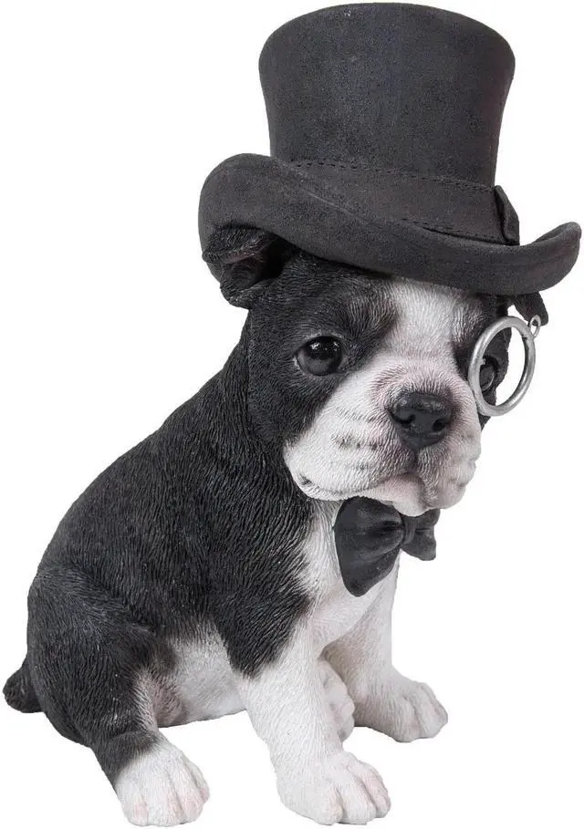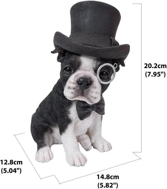 | Features | You will fall instantly in love with this irresistible adorable Boston Terrier with top hat, spectacle and bow tie statue. A creative gift for family or friend, or you could just treat yourself to this lovely figurine. A great gift for dog lovers. This statue will astonish you with its strikingly life-like design. Material: Durable Polyresin Incredibly realistic Intricate details Great for home and garden decor Theme: Animals Indoor/Outdoor use Colour: Black, White |
