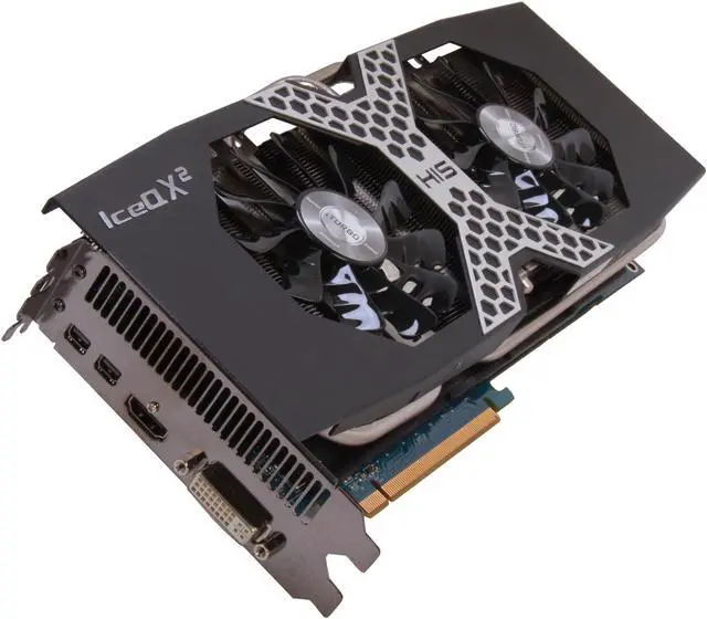 • neweggIceQ X² – Cooler, QuieterIceQ X² makes the card 63°F (17°C) cooler and 15dB quieter than the reference cooler. The card remains quiet whether you are gaming, socializing online, entertaining, or working. The two super large 89mm dual axial fans with Q&C fan blades cool the GPU directly and efficiently while keeping noise level at minimum. The extra large 40 x 47.5mm copper heatsink provides a large area to dissipate heat efficiently. Three 6mm and two 8mm wide heatpipes remove heat from the core area while memory and MOSFET heat sinks shed warmth from these areas.