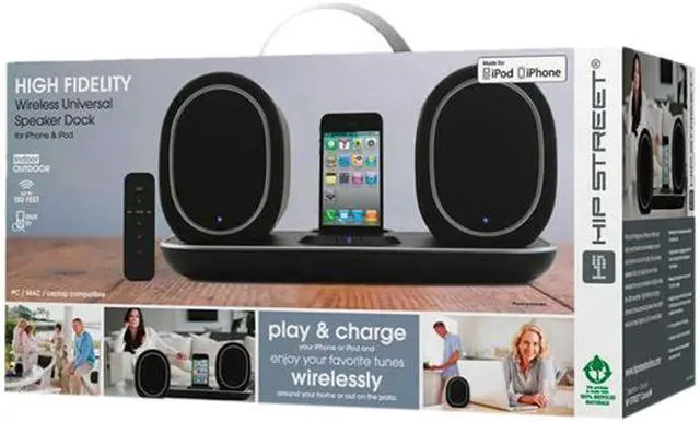 The Hip Street Wireless iPhone & iPod Docking Speaker System is specially designed for anyone who wants to enjoy their favorite songs with high quality sound either at home or out on the patio. Includes a wireless USB dongle so you can enjoy your music library from your PC. Works with iPod, iPhone, MP3 Players, and other portable devices with a 3.5mm headphone jack. Remote control is included.
