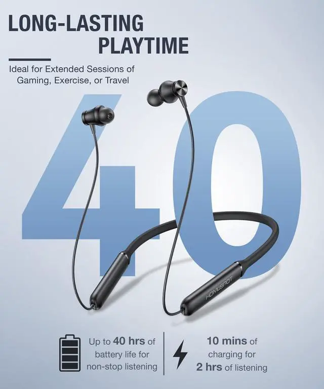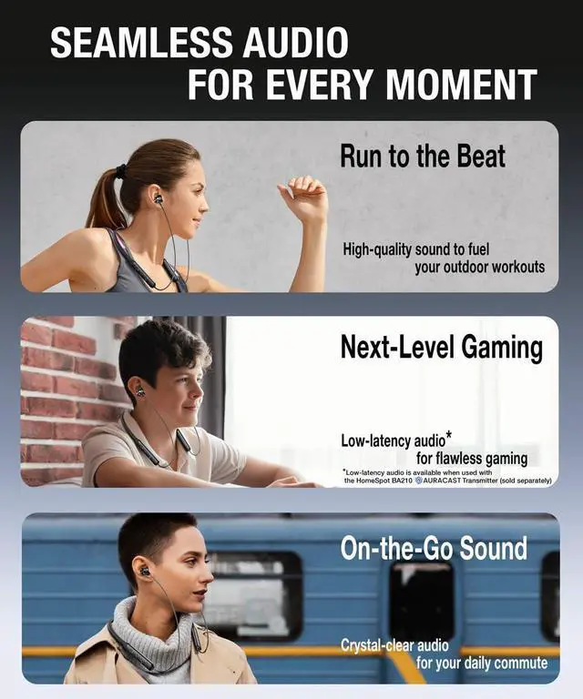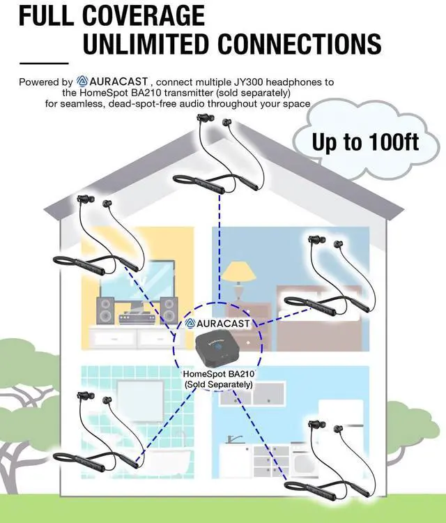 Designed for versatility, the HomeSpot JY300 wireless neckband headphones deliver premium audio quality, long-lasting comfort, and advanced connectivity features, making them ideal for workouts, gaming, TV watching and daily commutes. Powered by cutting-edge Bluetooth technology, they support aptX HD, AAC and LC3 audio codecs, ensuring high-resolution, lag-free sound | The headphones are Auracast-ready, offering seamless 1-to-many connectivity when paired with the HomeSpot BA210 Auracast Transmitter (sold separately). Users can enjoy full-house audio coverage with no dead spots and low-latency performance, especially in LC3 mode, enhancing both gaming and group listening experiences | The QK Audio app, a uniquely in-house-designed Auracast assistant app, allows users to effortlessly search for and listen to nearby broadcasts, ensuring an intuitive and future-proof listening experience | With up to 40 hours of battery life and a quick charge feature (10 minutes for 2 hours of playback), these headphones are built to keep up with your active lifestyle. The lightweight, flexible neckband ensures comfort throughout the day, while intuitive controls and a dedicated Auracast feature button make operation simple and seamless | The HomeSpot JY300 wireless neckband headphones are the perfect companion for those seeking high-quality sound, advanced functionality, and ultimate convenience in every scenario