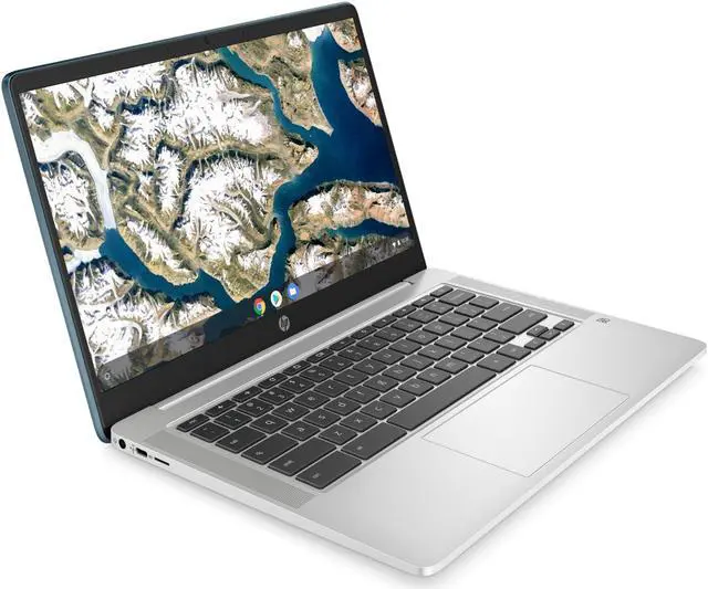 REFURBISHED ITEM - HP Chromebook 14a-na0062tg (NON-TOUCH), Chrome OS, Intel Pentium Silver N5030 Quad-Core Processor 1.10GHz, 4GB LPDDR4x-2933 MHz RAM (onboard), Intel UHD Graphics 605 (Integrated), 128GB eMMC, Finish: Forest teal (Top Cover) & Natural Silver (Keyboard deck), HP Wide Vision 720p HD camera, NO OPTICAL DRIVE, 14.0-inch diagonal HD micro-edge anti-glare Display (1366x768), Wireless 802.11a/b/g/n/ac (2x2) Wi-Fi + Bluetooth (MU-MIMO Supported), HD Audio with stereo speakers, Full-size backlit Keyboard, 30W USB Type-C power adapter, 2-cell 47WHr Li-ion polymer battery, Factory Recertified