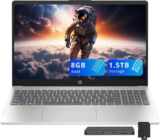 Windows 11 Home: 14.17" x 9.29" x 0.73", 3.52 lbs. Ports: 2 x USB Type-A, 1 x USB Type-C, 1 x HDMI, 1 x Headphone/ Microphone combo, 1 x AC Smart Pin. Wi-Fi 6 + Bluetooth 5.3. Silver. Bonus Docking Station Set: 1x 7-in-1 Docking Station w/ 1TB Storage, 1x 32GB MicroSD Card w/ Adapter, 1x Type-C Data Cable, 1x 3-in-1 Charging Cable, 1x Suede Cleaning Cloth.