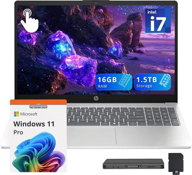 The HP 15.6" FHD Touchscreen Laptop offers fast performance with an Intel Core i7-1355U processor, smooth Intel Iris Xe graphics, a responsive touchscreen, a numeric keypad for easy data entry, and a 720p HD camera for clear video calls.