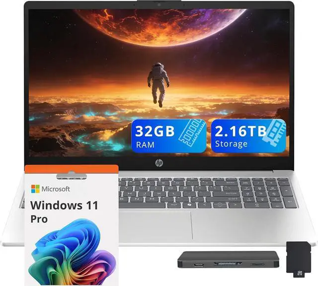 HP 15.6" HD Business Laptop, Intel Core i5-1334U, 32GB DDR4, 2.16TB Storage (2TB SSD+160GB Docking Station Set), Intel Iris Xe Graphics, Full Size Keyboard, HD Camera, Win 11 Pro, Silver