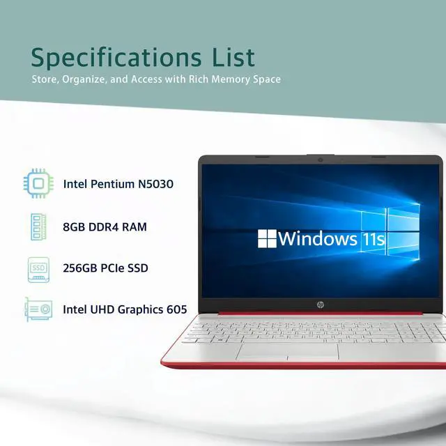 HP 15.6 HD Student Laptop, Intel Pentium Silver N5030, 8GB RAM, 256GB PCIe SSD, Intel UHD Graphics, HD Webcam, Numpad, Wi-Fi 5, Bluetooth, Win 10 S, Red, 32GB Snowbell USB Card