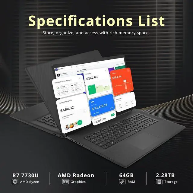 17.3" FHD IPS Anti-Glare DisplayThe professional and personal activities are bound to gain from the attractive brightness and brilliance. ^^AMD Ryzen 7 7730U ProcessorEffortlessly accelerate your creativity while powering through new levels of productivity in this blazing fast 8-core processor. Embrace highly efficient multitasking that unleashes your full potential in a boundless journey. ^^Full-Size KeyboardWork comfortably with an integrated numeric pad. AMD Radeon GraphicsIndulge in a visual feast as you embark on a journey of stunning visuals, vibrant colors, and smooth gameplay. ^^HP True Vision 720p HD CameraProvides high quality video calls, virtual meetings and online interactions.