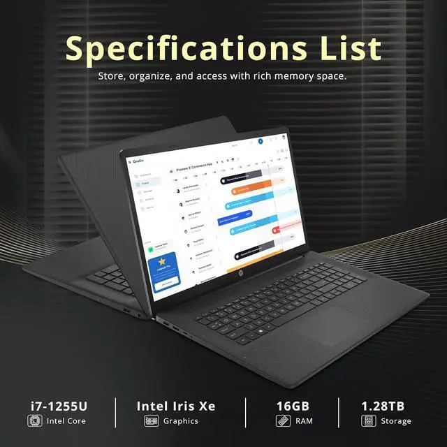 The HP 17.3" HD+ Business Laptop delivers fast, efficient performance with the Intel Core i7-1255U Processor, enabling smooth multitasking and responsive productivity for demanding business tasks, while the Intel Iris Xe Graphics enhances visual clarity and supports crisp presentations, data visualization, and everyday creative workflows on its spacious HD+ display.