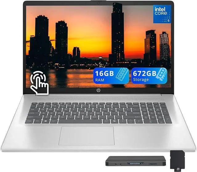 The HP 17.3" HD+ Touchscreen Laptop features an Intel Core 5 120U processor, Intel Graphics, a backlit keyboard with numeric keypad, offering expansive touch-enabled productivity in a spacious design.