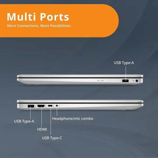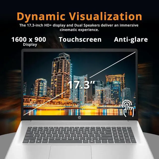 The HP 17.3" HD+ Touchscreen Laptop features an Intel Core 5 120U processor, Intel Graphics, a backlit keyboard with numeric keypad, offering expansive touch-enabled productivity in a spacious design.